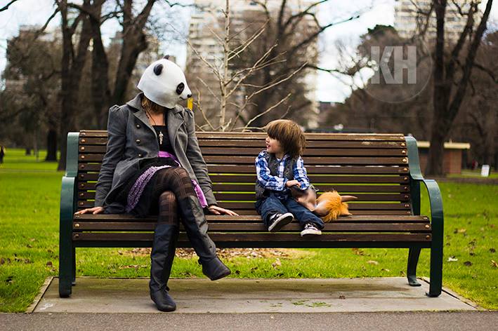 In a particularly touching image, a little boy with autism interacts with his panda-faced mother