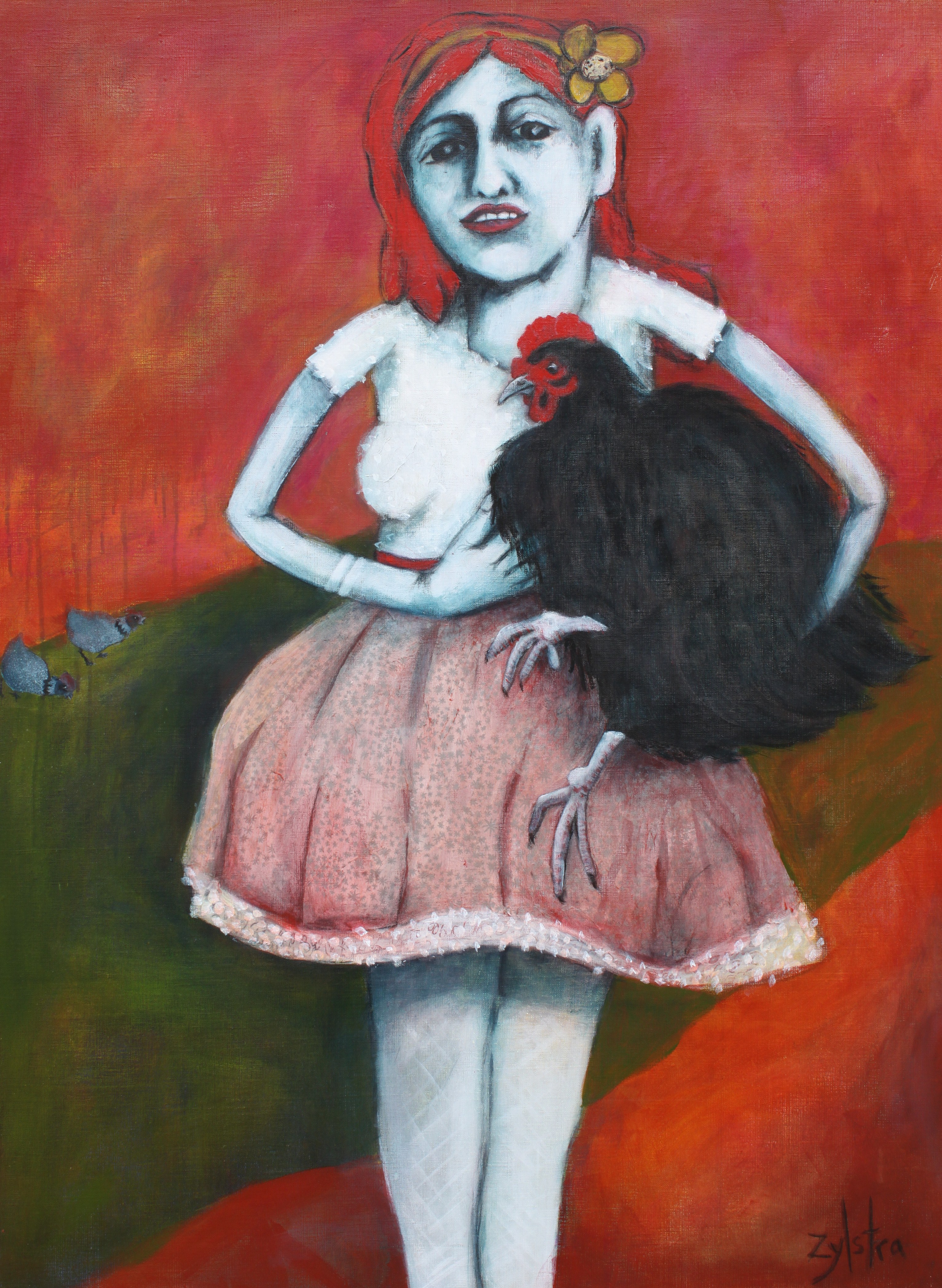 A delicate wisp of a girl, her skinny arms holding a chicken as body armour to protect her heart, and a tentative smile on her face. True to the name of the artwork, it was the best thing in the show.