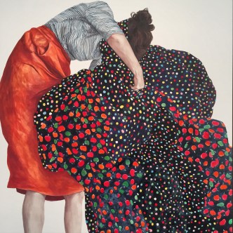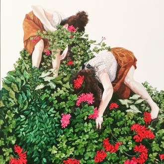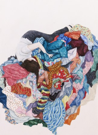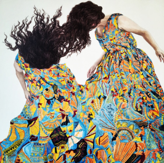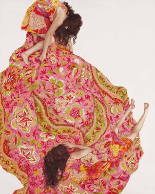It’s here within this narrative self that I find I connect with the work of Brisbane artist Megan Rohan. Since leaving art school just five years ago, Rohan has made her career out of faceless self-portraits. We know they’re self portraits because she says so, but without the face to confront and focus us, we are allowed our own interpretation. Her paintings are a tumbling, falling, floating mess of girls shrouded in fabric and textiles. The colour schemes, patterns and movement are what drive the emotion of these works which, done with oil on board, take on the effect of painted tiles and ceramic glaze.
