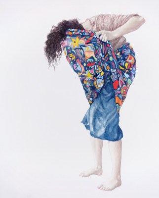 Rohan’s early works did occasionally include the face, alongside muted tones and subdued patterns, but the last two years has seen a stronger use of colour, more intricate patterns, expansive motion, and complete elimination of the face. Whether that was done consciously or instinctively, it is easy to see her new works as more confident and buoyant, despite the apparent shyness of the subject. Her recent solo show at Jan Murphy Gallery, called Topsy-Turvy, felt joyous and triumphant, even with angst ridden names such as Yeah Right Okay, Consequence and Predicament. The satisfaction and wonder evoked in me must have hit the mark elsewhere too, as the show was an immediate sell out.
