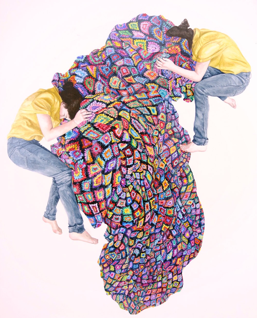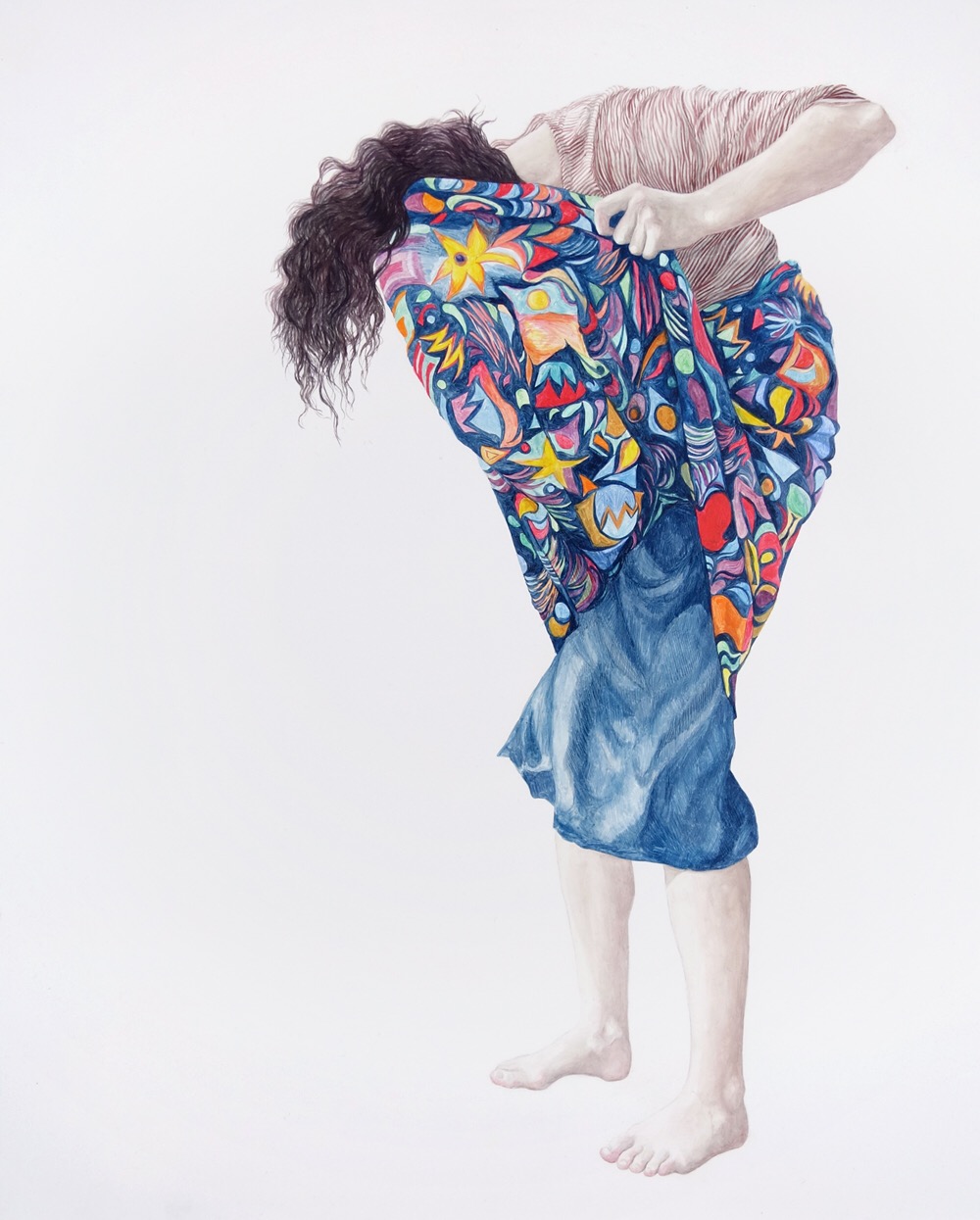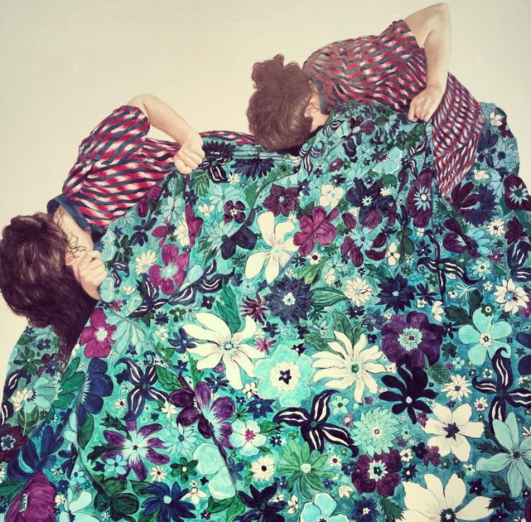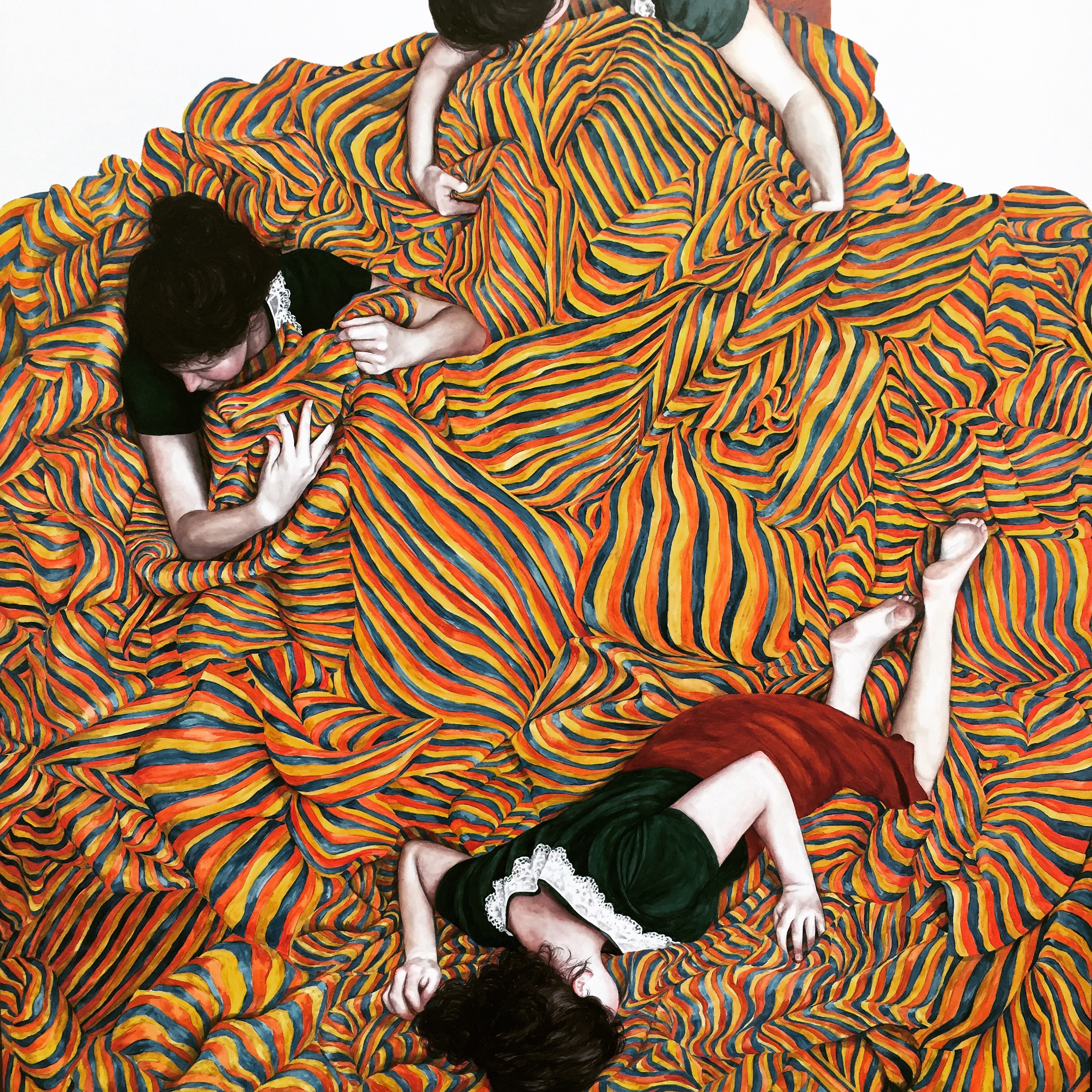 It’s here within this narrative self that I find I connect with the work of Brisbane artist Megan Rohan. Since leaving art school just five years ago, Rohan has made her career out of faceless self-portraits. We know they’re self portraits because she says so, but without the face to confront and focus us, we are allowed our own interpretation. Her paintings are a tumbling, falling, floating mess of girls shrouded in fabric and textiles. The colour schemes, patterns and movement are what drive the emotion of these works which, done with oil on board, take on the effect of painted tiles and ceramic glaze.