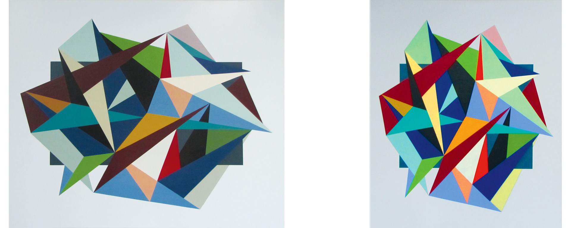 Harwood’s compositions are mathematically constructed studies in analysis, reason, contradiction and balance, with an architectural sensibility not unlike that of Bauhaus revolutionary Josef Albers. Albers, whose career was spent contemplating the problems of light and colour within geometric frames, was a significant contributor to the study of perception, and his influence is seen in Harwood’s prismatic compositions, whose work contains the same considerations of dynamic form and space, and evocations of colour field painting.