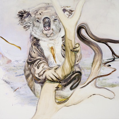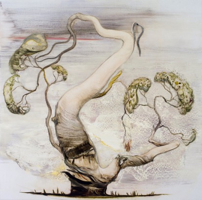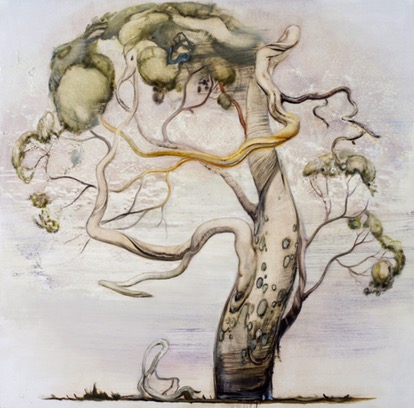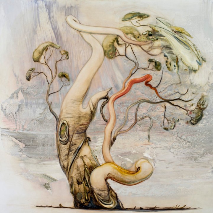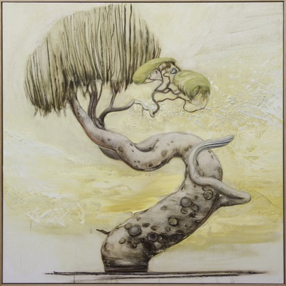 There is something eerily familiar about the trees that have begun to sprout up in Tim McMonagle’s work in recent times. An artist who has spent almost two decades disseminating human nature’s foibles and absurdities through his whimsical compositions, McMonagle has increasingly found himself compelled to consider the curious lifecycle of our majestic native gums. Already rich with folkloric, religious, and cultural symbolism, trees take on even greater significance in a country such as Australia, where the bush and outback landscapes are so closely intertwined with our national identity. Endlessly diverse in form, character and colour, their broken limbs and struggle for new growth provide McMonagle with the ideal allegory from which to contemplate the complexities of humanity and our connection to environment. Knotted, gnarled, and rather like a surreal Australian version of Blyton’s The Magic Faraway Tree, they dominate his canvases the way they do the outback, anthropomorphised to appear as the ultimate survivors in an unforgiving landscape.