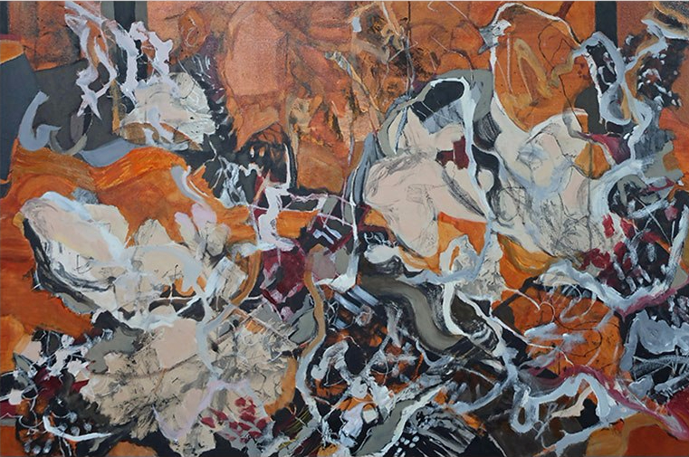 Though the colours and sensations evoked in Jones’ paintings are reminiscent of nature – of flowers, landscape and the brittle aridity of the Australian bush –any figurative elements quickly swim in and out of the viewer’s focus. Like a vague perception of a memory long held, these works are more akin to a sensory experience of environment than a precise replication. Energized by her experimentations with tone and gesture, Jones sets out to create something contemplative and abstract from her experiences – inspired not only by her physical surroundings, but by the general milieu of cultural references, life events, human interactions and emotional responses she observes. These are scenes less seen than remembered.