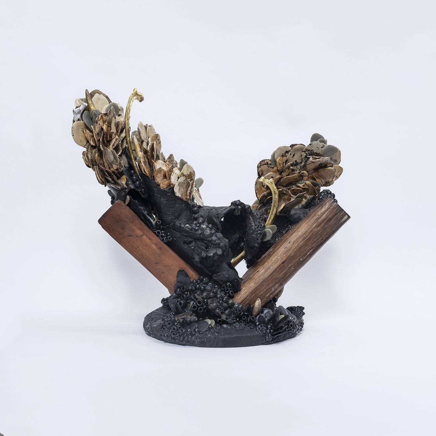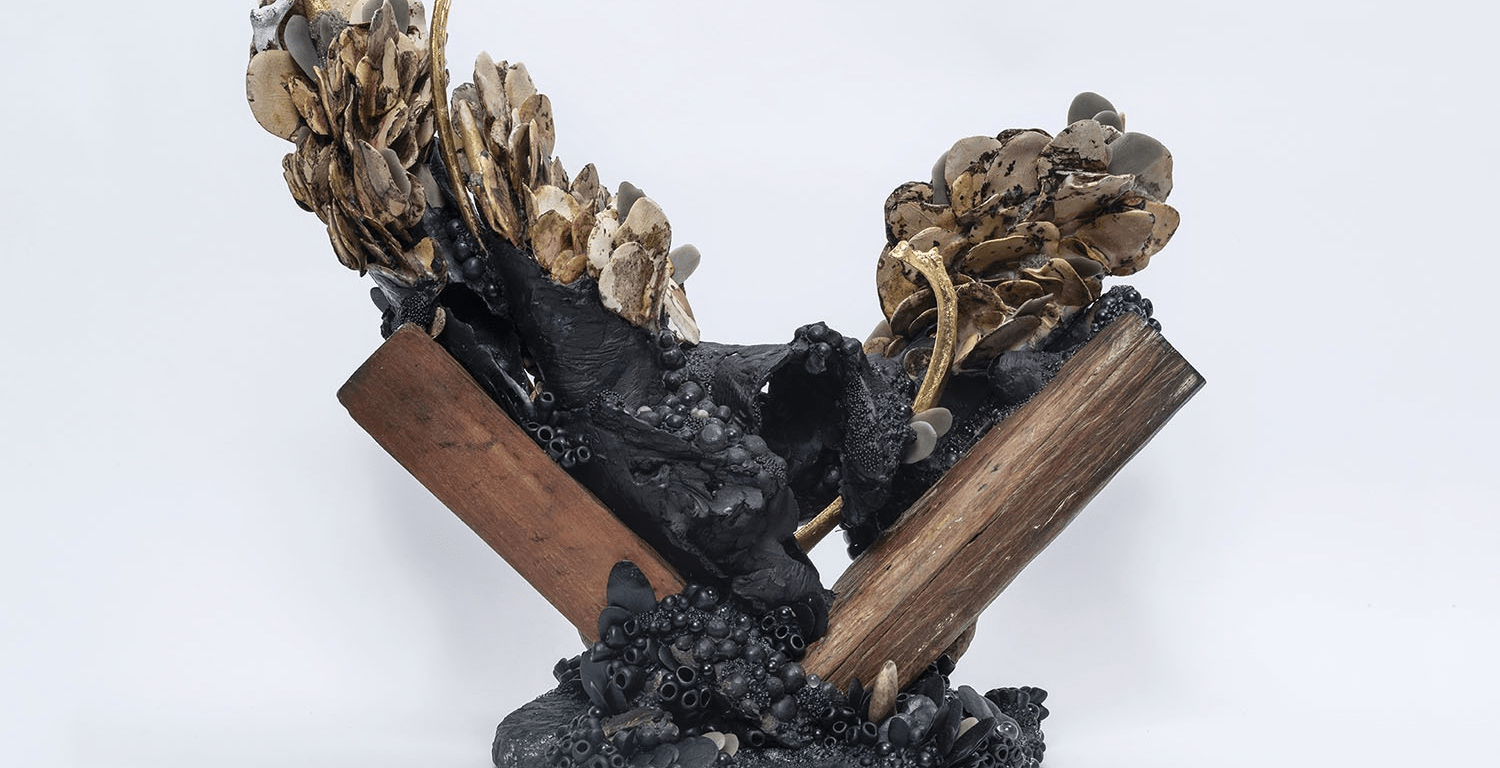 Drawn to a grotesque feminine aesthetic, she employs labour-intensive methods such as hand-stitching, carving, moulding and assemblage to draw out physical embodiments of her deep thought processes and highlight connections between her inner world, her home environment, and the natural world. Cornerstones might include personal memory, natural history, gothic imagery, or the lush and unruly garden surrounding her studio.