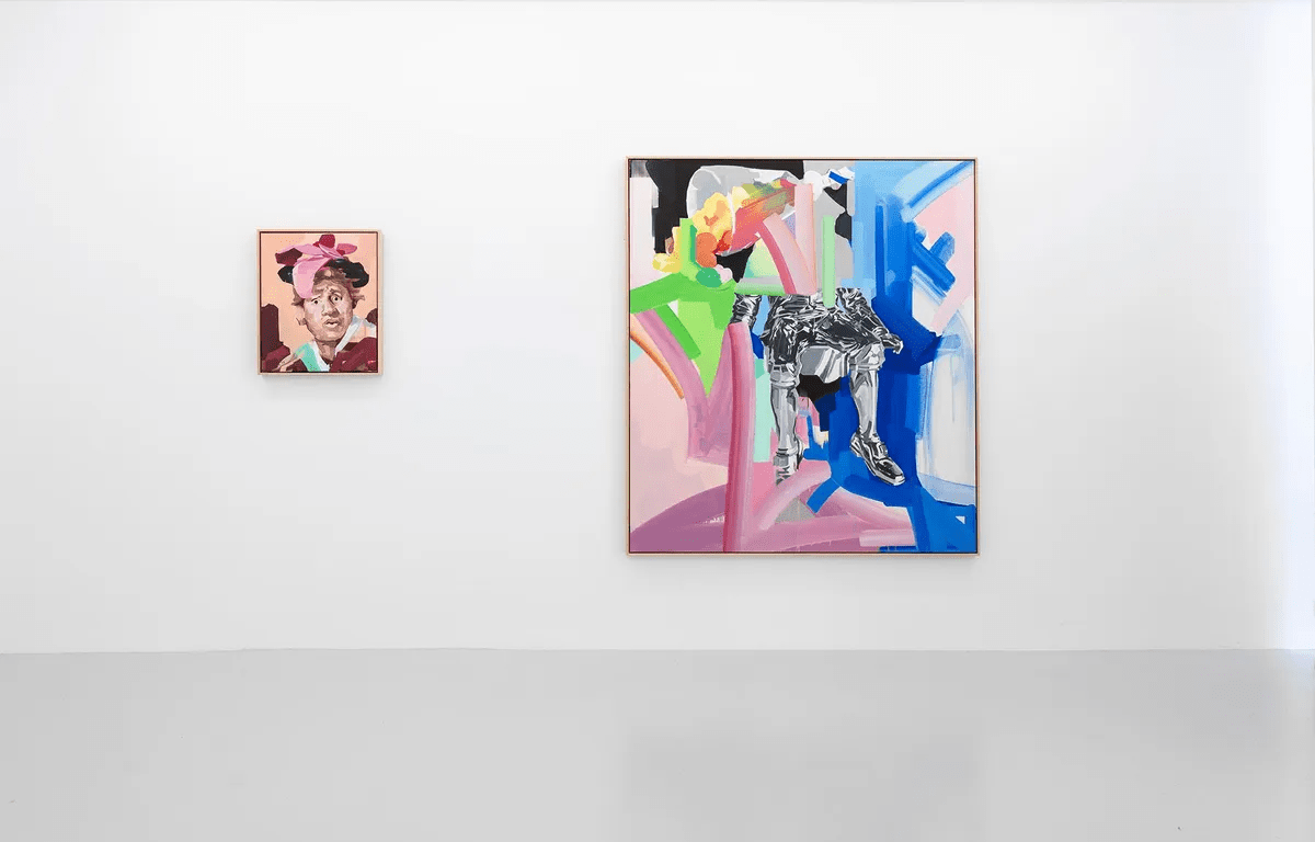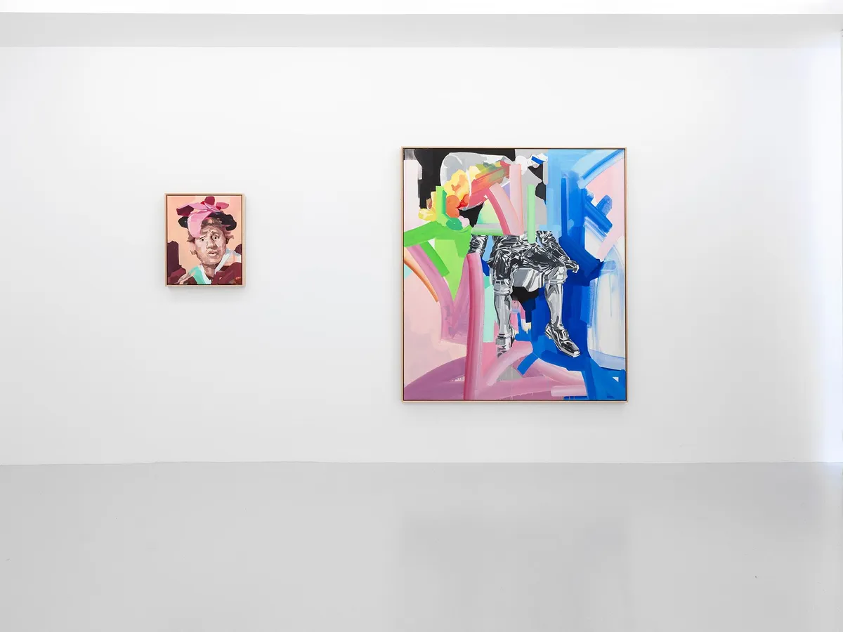 Beginning with reference images taken from pop culture or art history, or something that has piqued his interest online, Dunlop works quickly using a combination of collage and projection to compose the elements before transferring his ideas to canvas. Working in oils, he lets the process determine the direction, giving himself permission to wreck, remove and revisit ideas as he paints. He works across multiple paintings at a time, using this method as a forced separation that allows him to step back, take time to consider each canvas and remain spontaneous. The longer he spends on a painting the more abstracted it becomes, leading to the reintroduction of grounding elements such as fine art references and historical figures to add depth, and a sense of purpose.