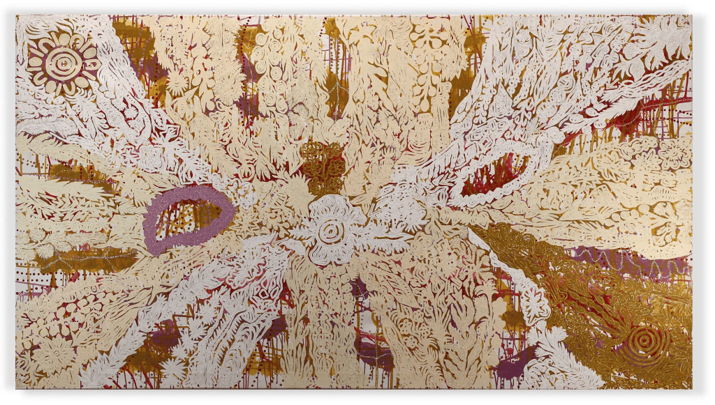 Throughout this process Candy seeks feedback from her peers and mentors, discussing ideas and approaches as she pushes the canvas towards the moment it feels finished. Each painting transforms multiple times as she reinterprets her father’s stories, the tali (sandhills), rock formations, waterholes and running water of her country during storm season, and the water birds, bush foods, and plant life that erupt after rain has reinvigorated the landscape.