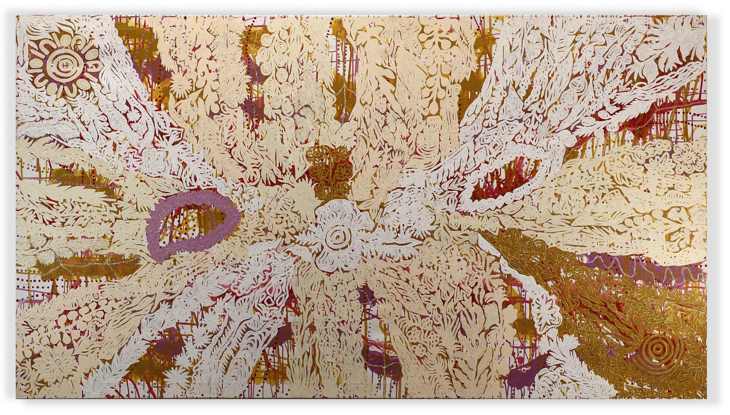 Candy learned to paint while being handed down family stories of Kalipinypa, the sacred Water Dreaming site north east of Kintore, and continues to be inspired by this cultural inheritance. An instinctive colourist, her primary consideration when approaching a new work is the selection of seven or eight colours that will make up the lacelike layers for which her paintings have become known, and she will often revisit her archive to analyse favourite combinations. Working on the ground, she begins each canvas with a coat of drips and washes in a handful of watered down colours. Once dry, she uses fine brushes to paint intricate designs in high contrasting colour, then adds a third layer of design in the original base colours.