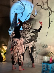 My work usually always starts with drawing and is then transformed into three-dimensional works (soft-sculpture and costume), which then becomes part of live performance-based and installation work. These varied ways of working are all interrelated and cross over to become one whole work. I consider my performances as live, interactive versions of the environments and hybrid forms that are present in my drawings. As part of my residency, I was invited to create a performance-based work where I collaborated with dancer, Frankie Jaiyeola, musicians Michael Medlicott and Tom Hinchcliffe and video artist Jac Bates. The work became a response to the site in Fish Lane and ended up being quite an intimate and intuitive drawing performance.