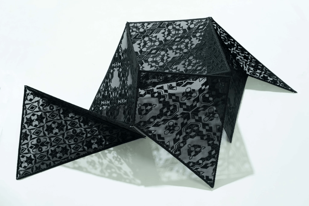 Most recently, Stok has been contemplating domestic spaces, and what allows a house to become a home. Working with flyscreen, nylon fishing line and stainless steel swivels, Stok has reimagined household napery and window dressings as intimate and subversive sculptural pieces that retain the fluidity of linen despite the rigidity of the materials. Bordered with fine filigree, their delicate domesticity belies the fact their separate components are used by hunters to capture prey.