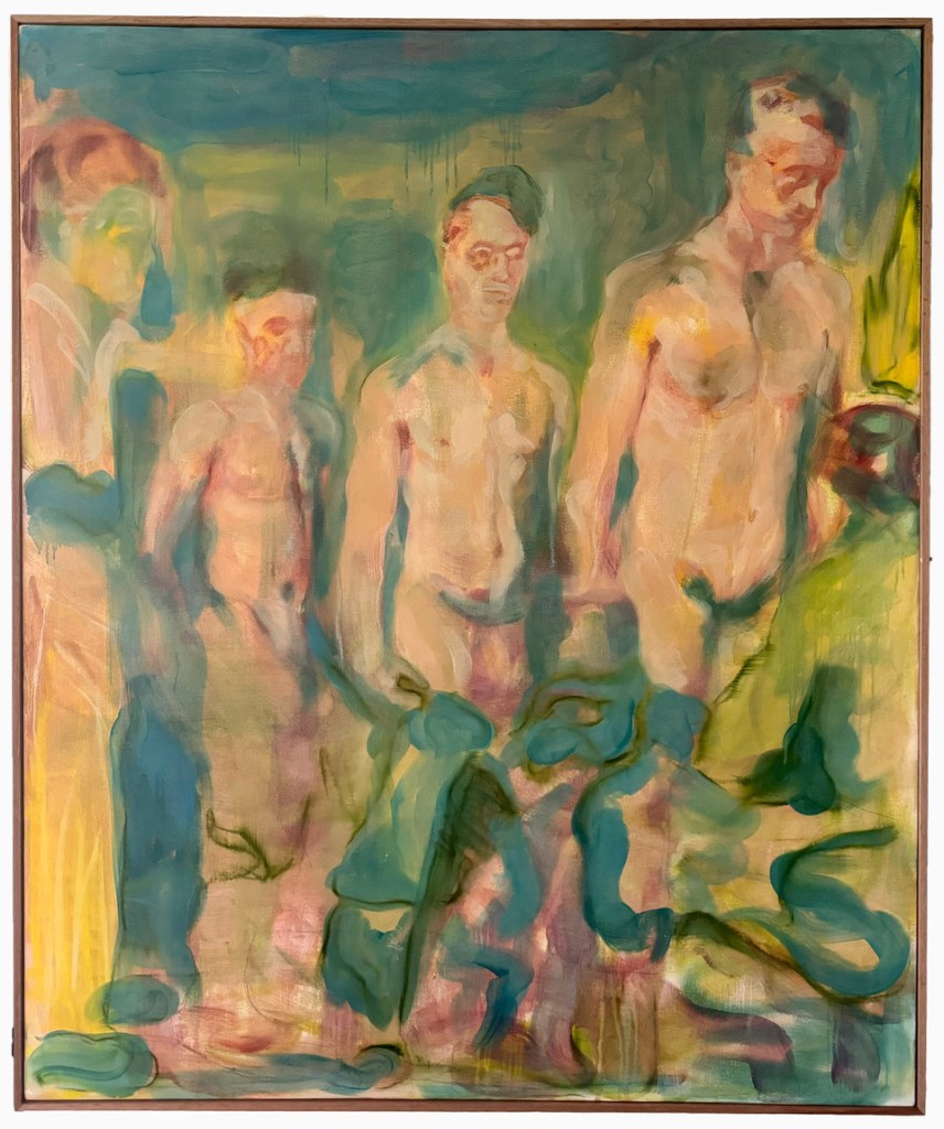 Brito fled Cuba in 2007 and subsequently lost contact with his family, friends and culture. Also lost were the tangible objects that help keep memories alive – letters, trinkets, and photos. Brito uses images sourced from the internet as a proxy, deconstructing and reassembling them alongside his recollections of the people and places he left behind. The men in these works might be lovers, but they might just as easily be close friends, brothers or cousins. He maps the figures out deliberately, before sweeping layers of colour across the canvas to envelop the scene in a haze of nostalgia.
