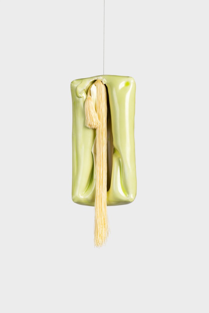 A gentle draft of air slowly turns one of the suspended works (Busted, 2024) away from me, and I notice Choi has left the verso purposefully unfinished. You can see how its lemony tassel is held in place, and beyond, its unglazed centre. This glimpse of Busted’s interior gives the work a melancholic vulnerability, and I can’t help but feel a twinge of empathy for it. Of all the physical or emotional responses I’ve had to visual art, feeling compassion for a ceramic was not on my bingo card. But such is the anthropomorphic charm of Choi’s art practice.