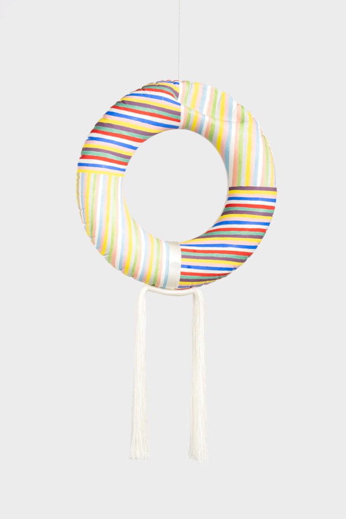 At first glance it’s very easy to classify Choi’s work as pretty or decorative, because, well…it is. Her distinctive style straddles painting and sculpture, engaging with colour, composition and structure while embracing chance and creative impulses. Her forms are quirky and tactile, moulded from disparate items that shouldn’t really work together, such as inflatable toys and familial objects she recreates out of cardboard. Some are instantly recognisable, like the blow-up swim ring that features regularly. Another arrangement of squared forms echoes cuisenaire rods, the mathematical learning aides. Many seem to be in a state of either inflation or deflation – some appear to float or hover, while others cave, sink and fold back in on themselves.