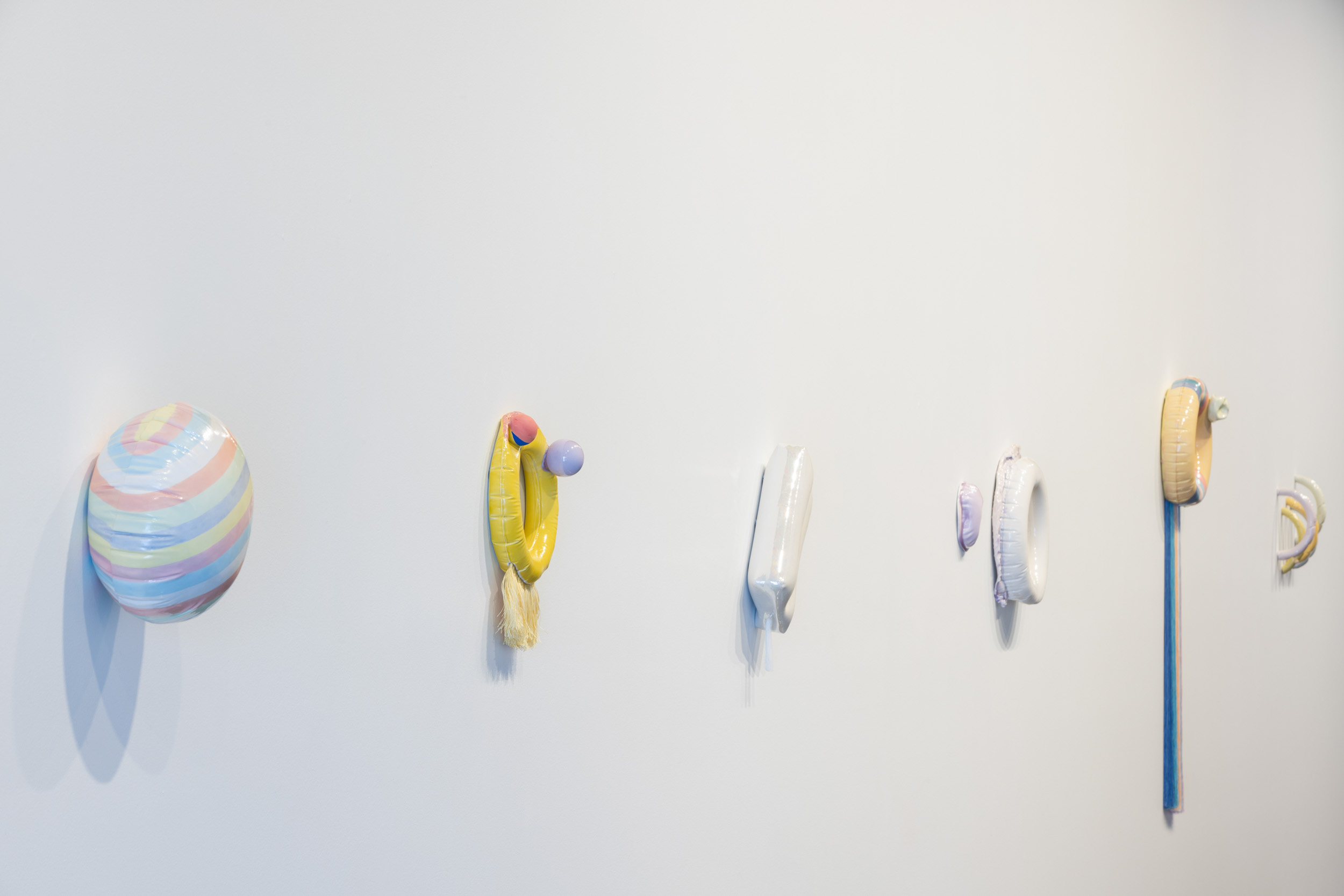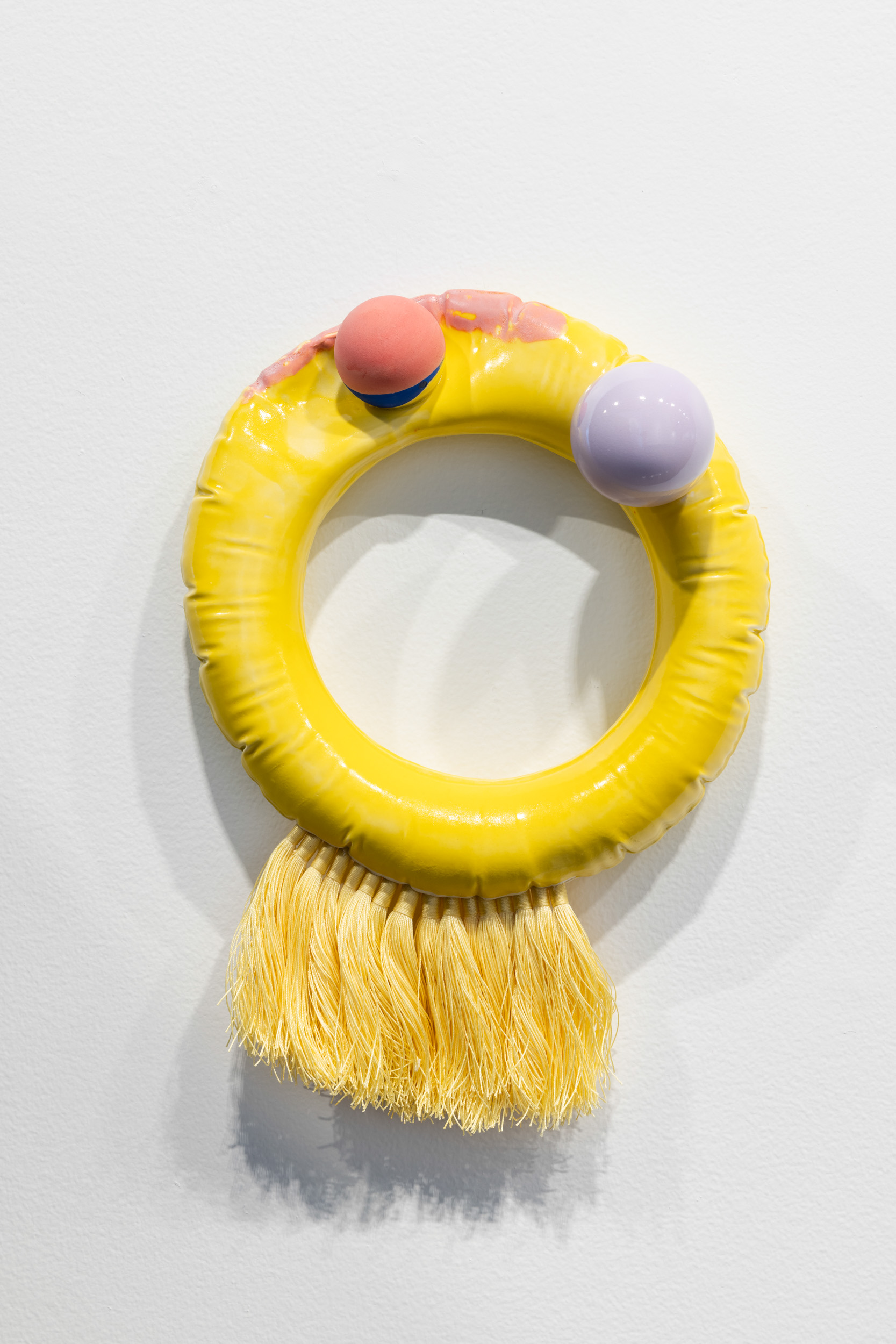 A gentle draft of air slowly turns one of the suspended works (Busted, 2024) away from me, and I notice Choi has left the verso purposefully unfinished. You can see how its lemony tassel is held in place, and beyond, its unglazed centre. This glimpse of Busted’s interior gives the work a melancholic vulnerability, and I can’t help but feel a twinge of empathy for it. Of all the physical or emotional responses I’ve had to visual art, feeling compassion for a ceramic was not on my bingo card. But such is the anthropomorphic charm of Choi’s art practice.