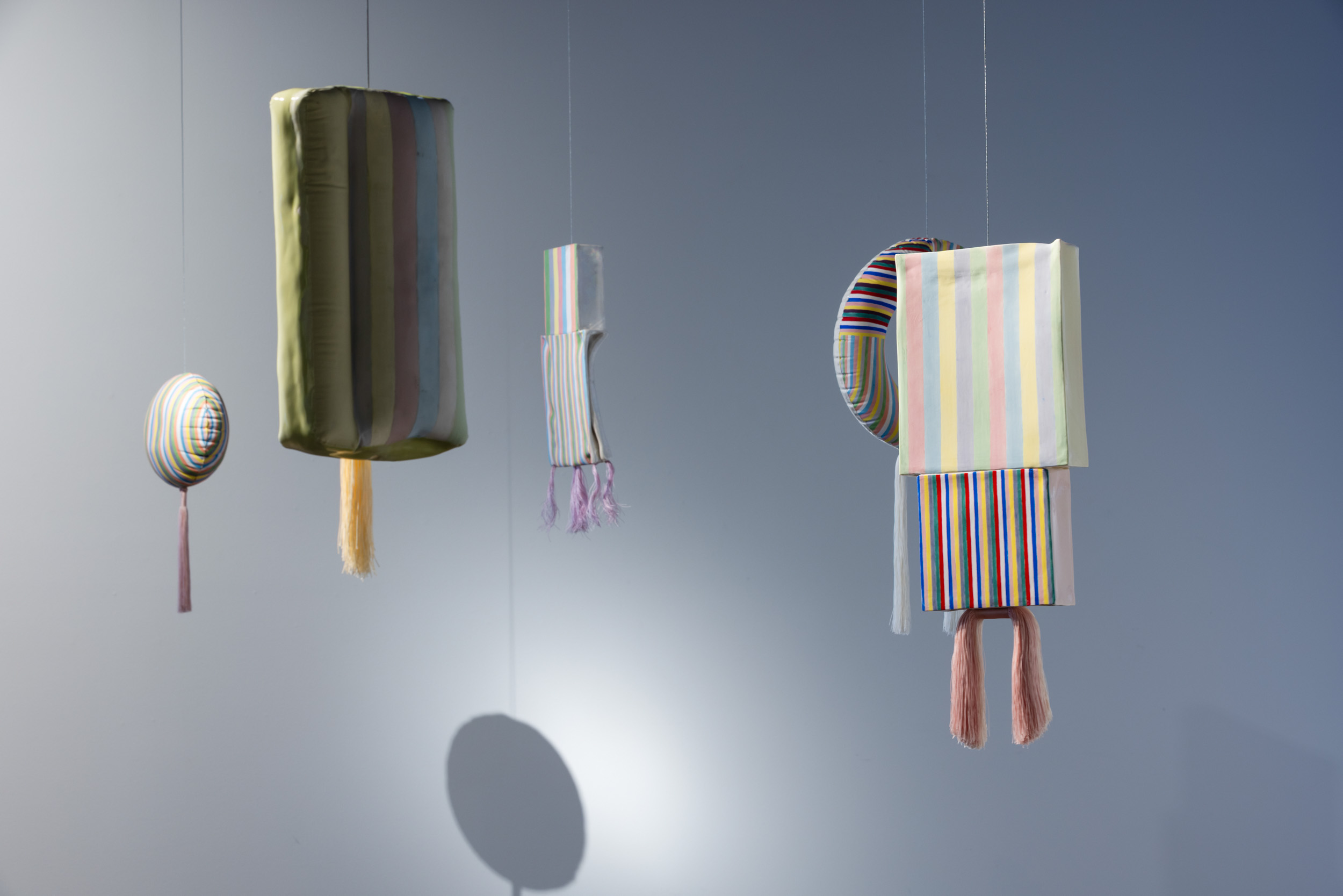 Choi came to visual art later in life, which perhaps accounts for a more nuanced consideration of identity and otherness. Her experience as a child of migrant parents is subtly reflected in her work through glazes that replicate the seven colours of a saekdongot, the traditional Korean hanbok worn by children. In Searching Chords, the reference is made more explicit by the addition of hand strung tassels and bindings. The combination of colours in the striped saekdong pattern is traditionally said to elicit harmony, while the rainbow depicts thoughts of children’s pure dreams. Here, there are two versions of saekdong – one, the customary colourway called obangsaek; the other, Choi’s more contemporary interpretation in pastel candy colours. It doesn’t require a huge leap of imagination to read this as reflective of a chasm between her parents’ dreams and her own – an idea further enhanced by a suspended ring titled Union which intersects both colourways.