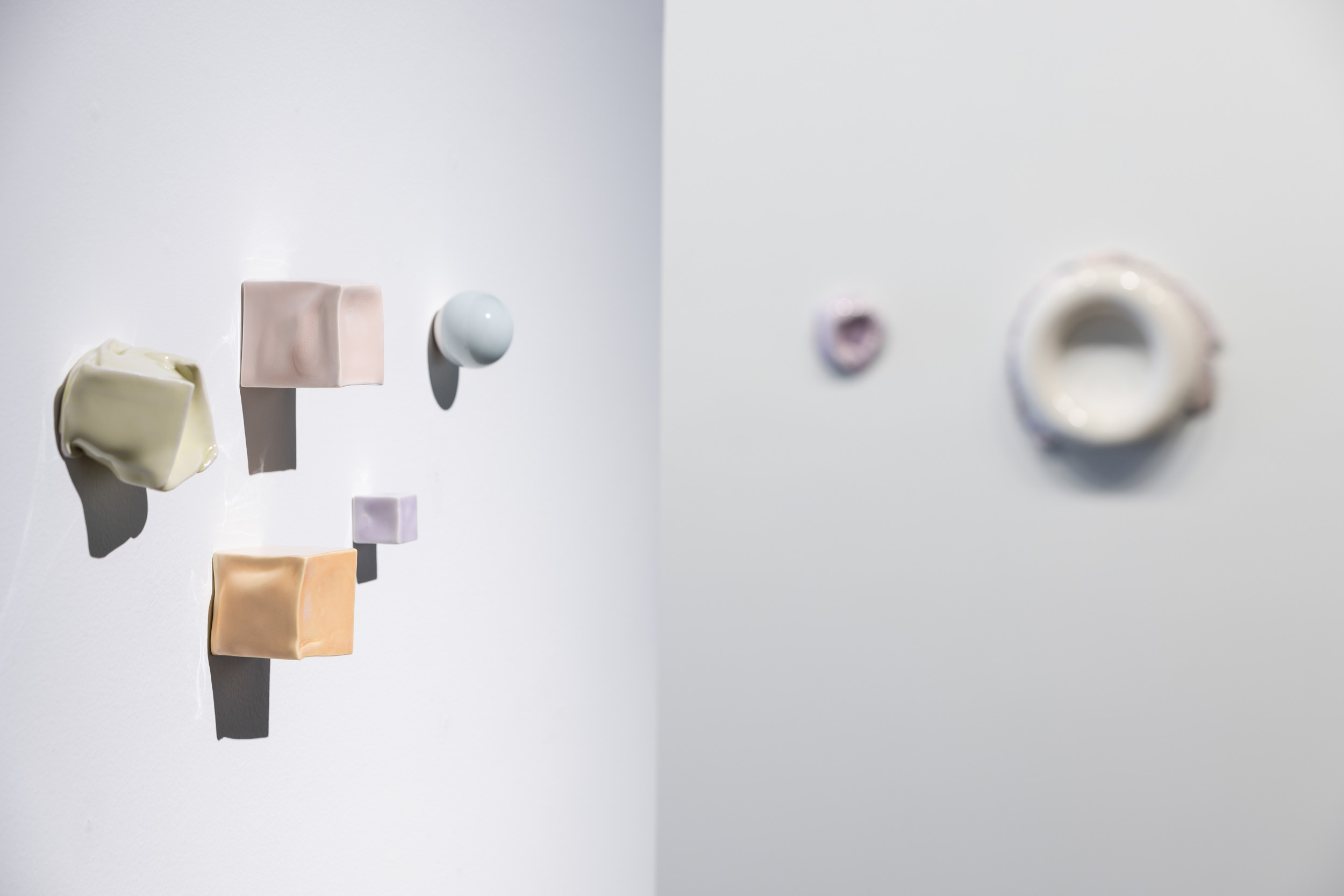 Despite being inherently fragile, very few are made to sit on stable surfaces. Most are wall-mounted or hang from the gallery’s high ceiling on fine wires, looking from a distance like a row of tiered lanterns and foil balloons. The improbability of ceramics being displayed so precariously creates an absurdist ‘Alice Through the Looking Glass’ effect. I can’t help but wonder how her nerves, and those of her gallerists, can withstand the installation process. This tension is paramount for Choi, who claims to know a form is working if it makes her laugh.