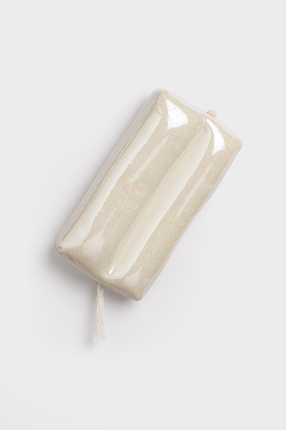 When I ask Choi how much of her own biography should be read into her art practice, she shrugs. ‘My works hold cultural significance, inasmuch as shapes like the inflatable ring speak to Australian beach culture and representation, or lack of. But it’s as much a gut response to the unpredictable nature of ceramic as it is my personal story.’ She points to a work titled Diphthong. ‘I moulded that one from an inflatable jukebox because I was drawn to the shape, but when I cast it I immediately saw tteok, the Korean rice cakes.’